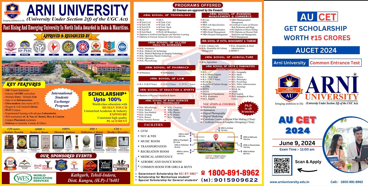 Arni University (AU) is a leading Indian institution of higher education, providing a rare combination of technical and academic excellence to its students. Since 2009, the university has been accredited by UGC, India. Our students are emancipated by a wide range of programs combined with versatility, experiential learning and interdisciplinary orientation to develop their passions and seek dream careers. At Arni University we are grooming students to be socially sensitive through intellectually challenging and contemporary diverse culture. ‘Skill Comprehensive Higher Education' is appropriately remembered by Arni University as a visionary. Its specific paradigm places special focus on building sustainable livelihoods in difficult geographies on a national scale through higher education that contributes to employability and sparks entrepreneurship.